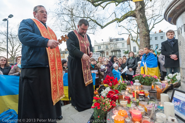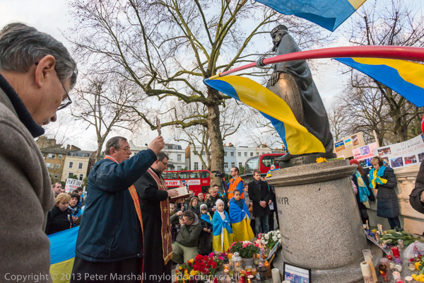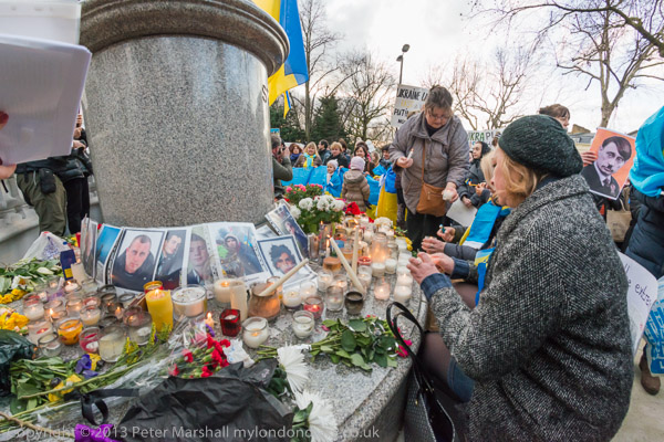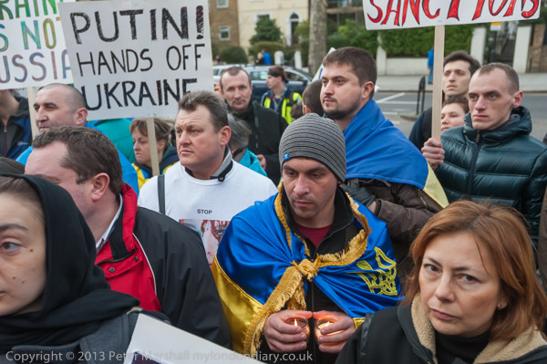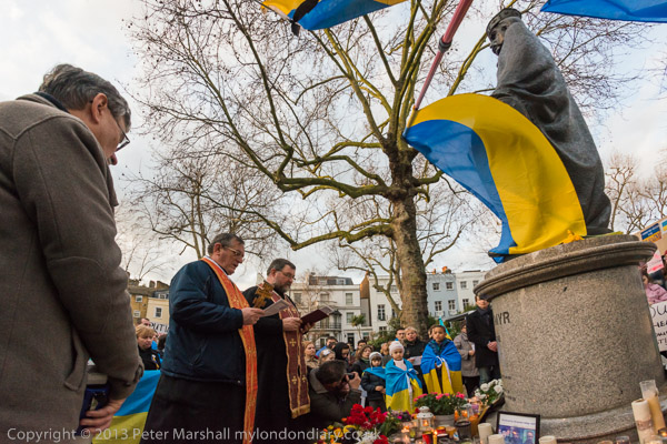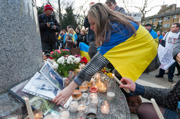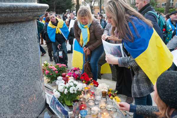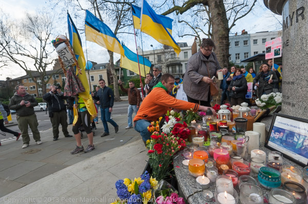 'Ukraine is Not Russia', 'Putin! Hands off Ukraine'. The crowd in front of the statue