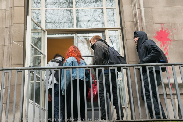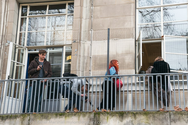Some decided to climb out of the windo onto a balcony. They looked through some windows