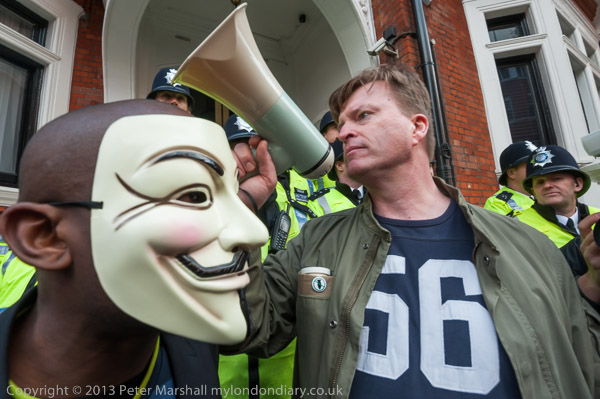 The protest here was in support of of Julian Assange and Edward Snowden and other whistle blowers and over the continued refusal to grant Assange safe passage to Ecuador, something that seems to be an personal vendetta by Home Secretary Teresa May which is costing the tax-payer a fortune - around £5.3 million to the end of last year - which many feel should be personally surcharged to Ms May.