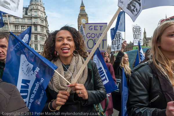 Thousands of teachers marched through London calling on Michael Gove to resign for his attacks on their pay, pensions, conditions and job security and his denigration and undermining for their professional status.