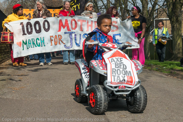 At the very front of the march, ahead of the '1000 Mothers March for Justice' banner was Spiderman, a young boy dressed in the outfit and riding in a small electric car with a poster 'Axe Bedroom Tax' on its front.