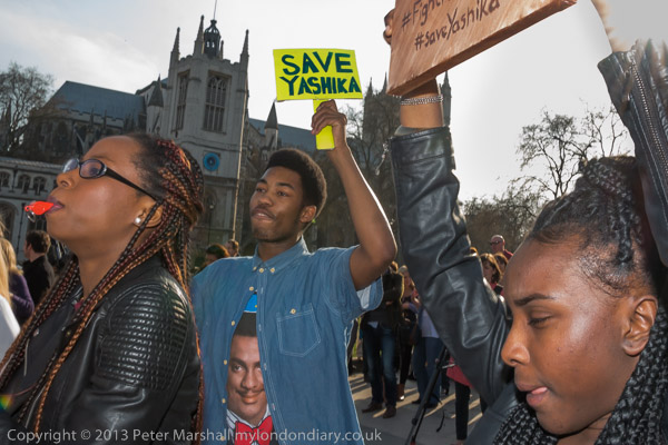 from Oasis Academy in Parliament SquareA lively protest by fellow students and supporters at Parliament urged Teresa May to abandon the planned deportation of 18 year old model A-level student Yashika Bageerathi to Mauritius due to take place on Mothers Day.