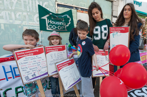 I spent only a short time at this two hour event on the busy shopping street of Kilburn High Road, where Kilburn Square is simply a wider area of pavement in front of some shops. There the Counihan family and their friends and supporters in the Housing for All campaign, including the Trade Unionist and Socialist Coalition (TUSC) and Unite Community, were handing out balloons to children and talking to people about housing problems and child hunger.