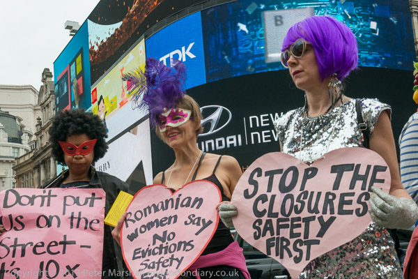 Last October I photographed a protest in outside the Soho Estates offices in Greek Street after a number of women were evicted from their flats in Romilly St. Police had threatened to prosecute Soho Estates for allowing their premises to be used as brothels, and they threatened the leaseholders who evicted the women. The flats were self-contained with only one sex-worker in each, and so were not legally brothels - so there was no case to answer, but the managing director of Soho estates (the son-in-law of the late Paul Raymond) refused to back the women. Working in flats like these is relatively safe, while out on the streets sex is a very dangerous business.