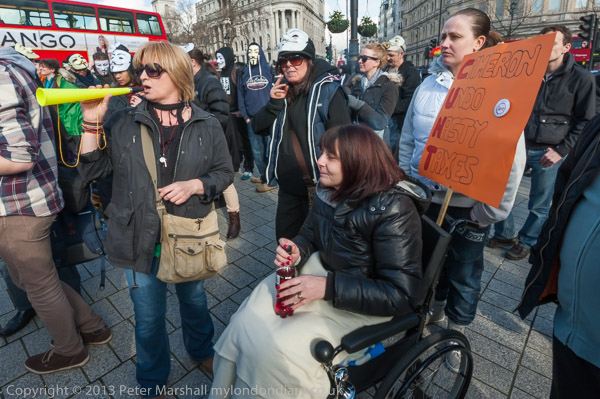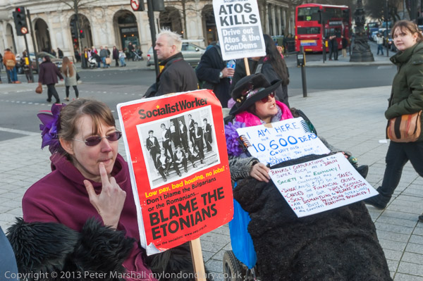 A disabled protester with friends and a placard 'Cameron Undo Nasty Taxes'