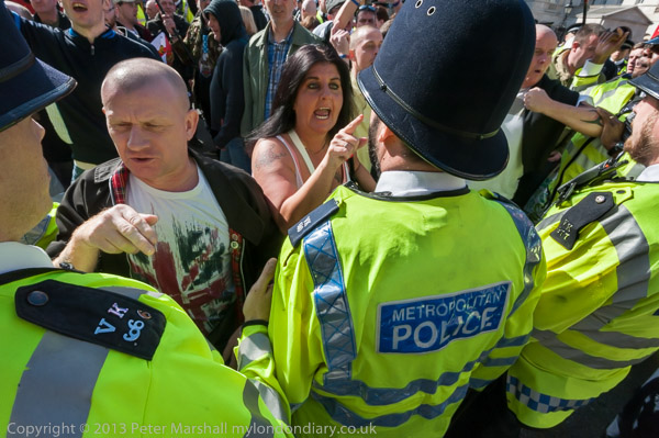 EVF make an attempt to rush towards the counter protesters but police and stewards hold them back