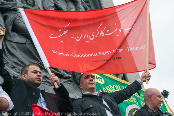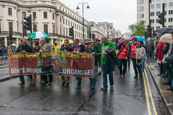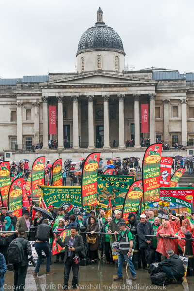 RMT marchers with Bod Crow banners come into Trafalgar Square
