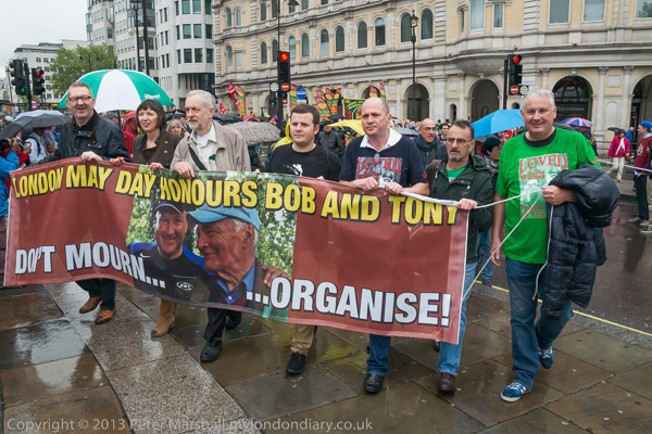 Len McCluskey (Unite), Frances O'Grady (TUC), Jeremy Corbyn MP and others holding the banner