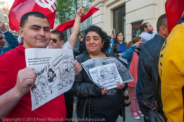 treat them properly - cartoon shows CEO Ruby McGregor-Smith kicking a cleaner. She got £1.37m in 2013.