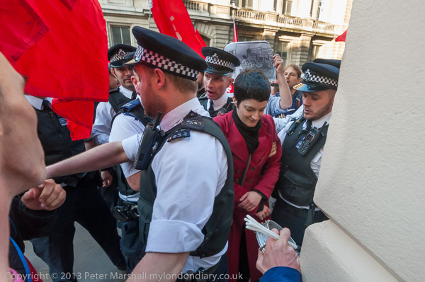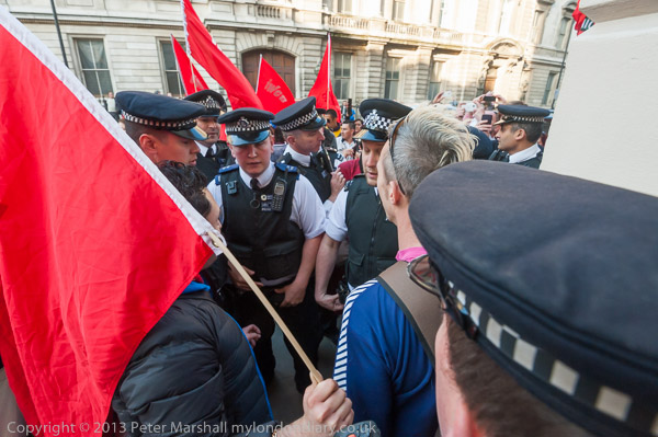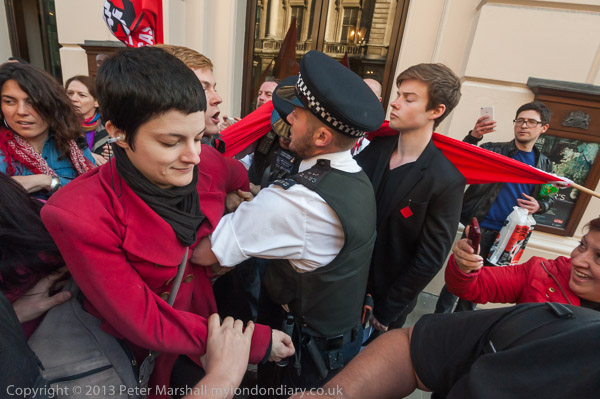 Police arrived in force and tried to grab one of the protesters