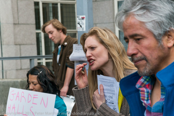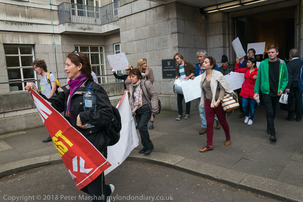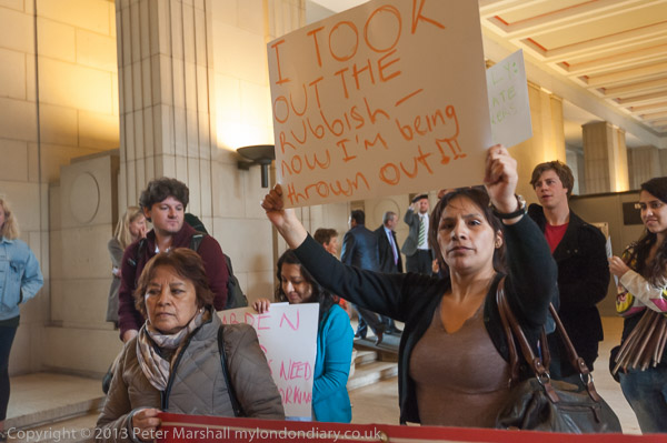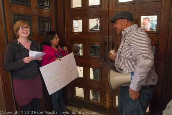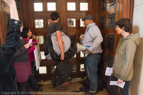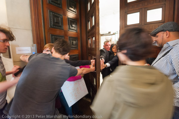 but the security staff manage to pull the door closed. The protest remains good-natured and the attempt to