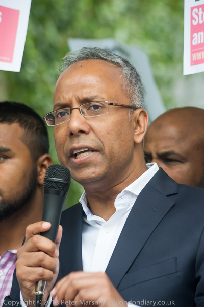 Tower Hamlets Mayor Lutfur Rahman talks with a protester