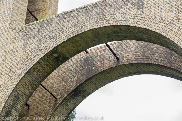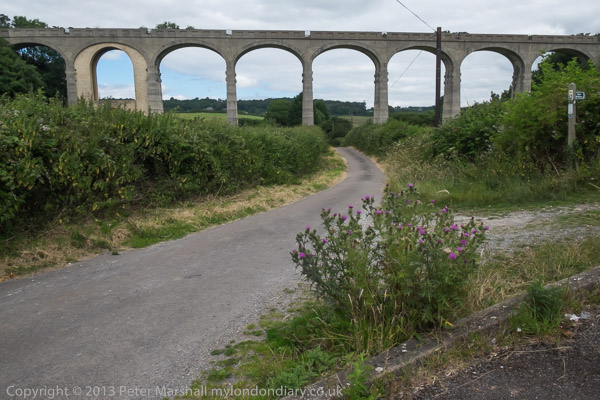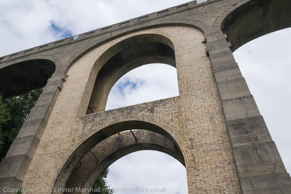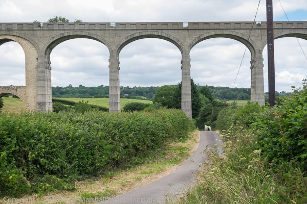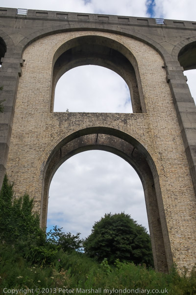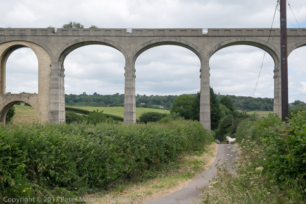 ![]() So we took far too many pictures of it ![]() The railway was a 'Light Railway' and got the go-ahead in 1896, but the viaduct was only finished in 1903 ![]() It was one of the first and highest to be built with mass concrete with pre-cast concrete voussoirs ![]() and one arch had to be reinforced after some slippage happened during the building ![]() with a brick arch ring. ![]() A stream runs under the viaduct close to this arch ![]() The viaduct is a little over 600 ft long and the arches are 50 ft wide and 92 ft high. ![]() As we were leaving, a white horse appeared underneath it - so more pictures... ![]() |