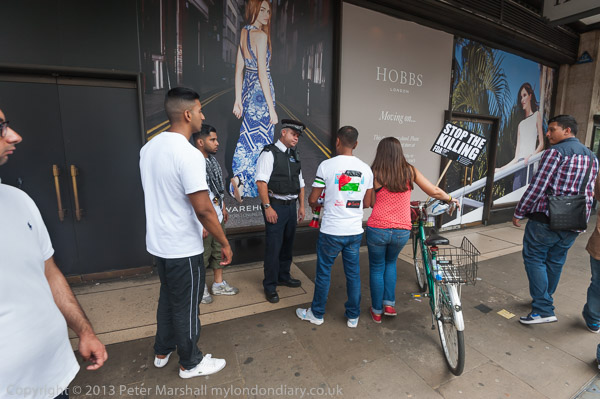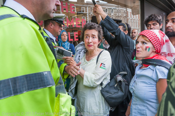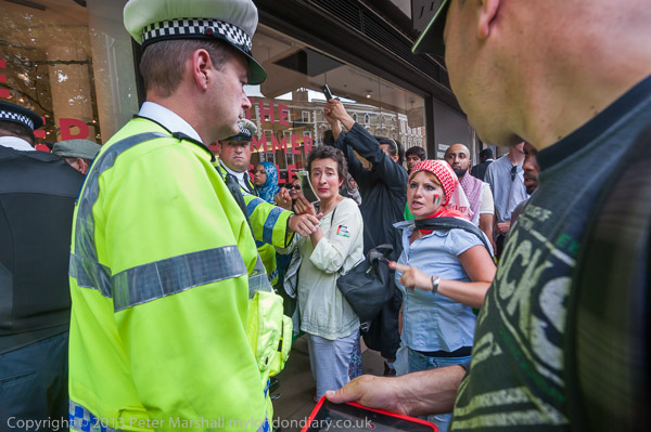 Police argue with protesters who stopped to argue with someone in a shop doorway who shouted anti-Palestine comments