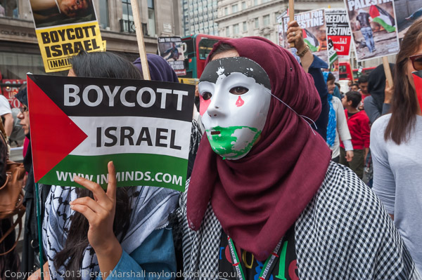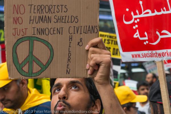 One woman had a placard with an an alleged quotation from Ariel Sharon about burning Palestinian children