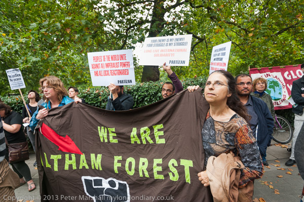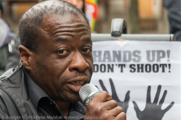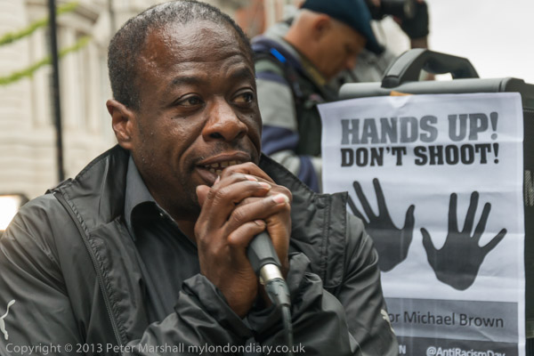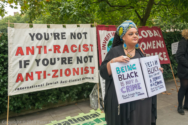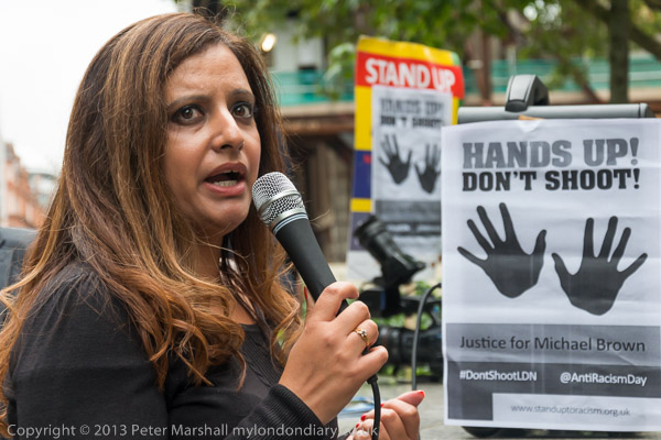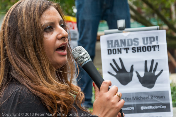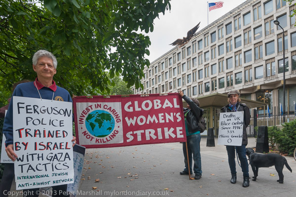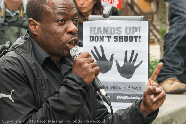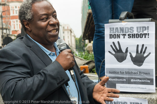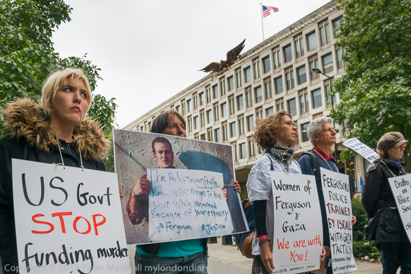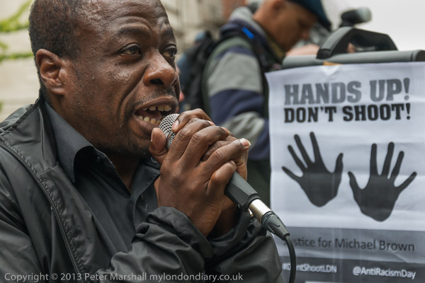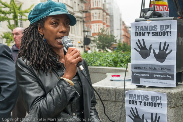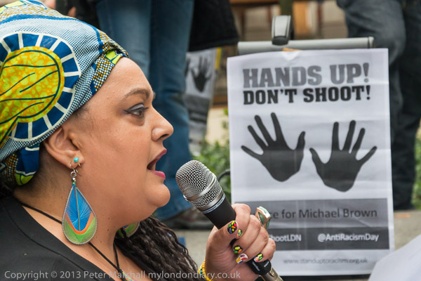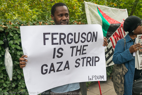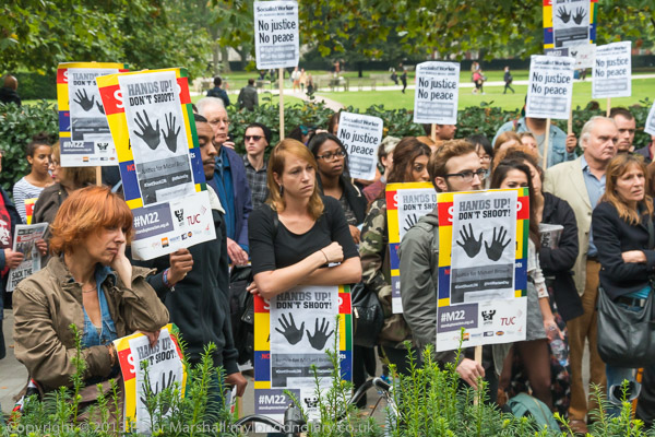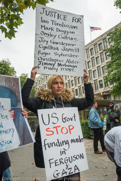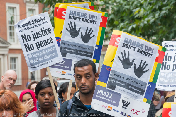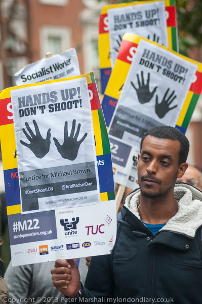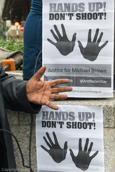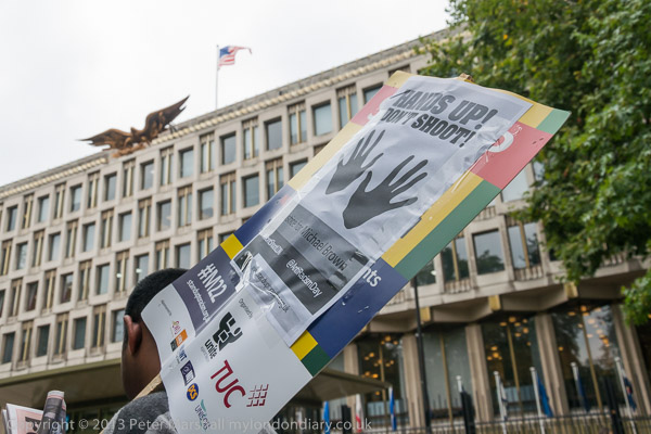 Hands Up! Don't Shoot! poster on a Stand Up to Racism placard at the US Embasy