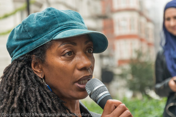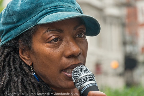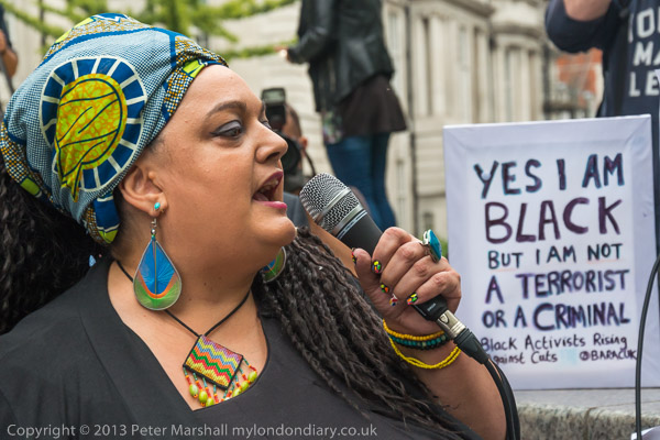 Zita Holborne holds up two BARAC posters, one reading 'Being Black is not a crime'