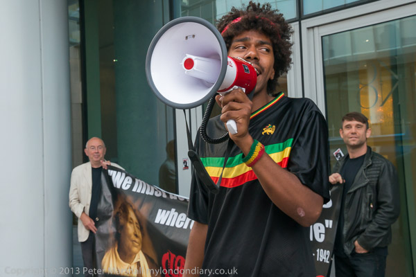 The protest at the embassy in Notting Hill was attended by around 40 people from the Metropolitan Community Church, the Out & Proud Diamond Group and the Peter Tatchell Foundation, with Peter Tatchell himself taking part. There was a great deal of loud drumming, shouting and dancing on the road and pavement in front of the protest.