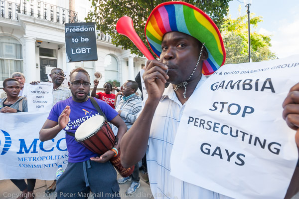 Protesters at the Gambian Embassy called on President Yahya Jammeh to reject the bill passed by MPs on August 25 which would give life sentences for 'aggravated homosexuality, apparently including repeat offenders, and those with HIV.