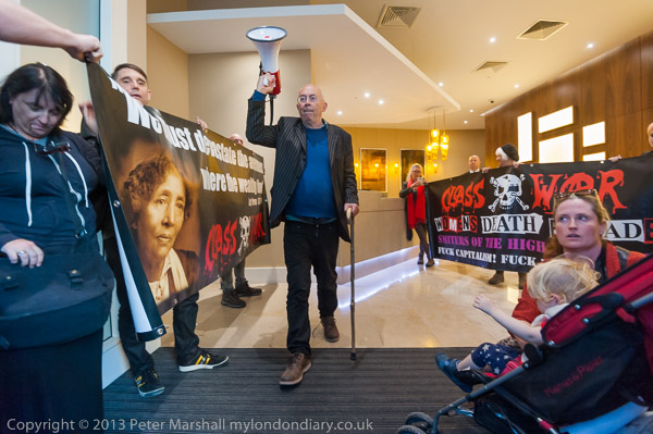 I arrived just as the protest was starting with the usual banners outside the 'rich door' of the building on Whitechapel High St. One of Class War's parliamentary candidates was photographing the notices by the side of the door as the building manager opened it to let out two residents, and talked to him as another Class War protester put his foot in the door to keep it open. The manager walked back into the building towards the reception desk, and, seeing their chance, a group of protesters followed him, taking in their banners and occupying the area.