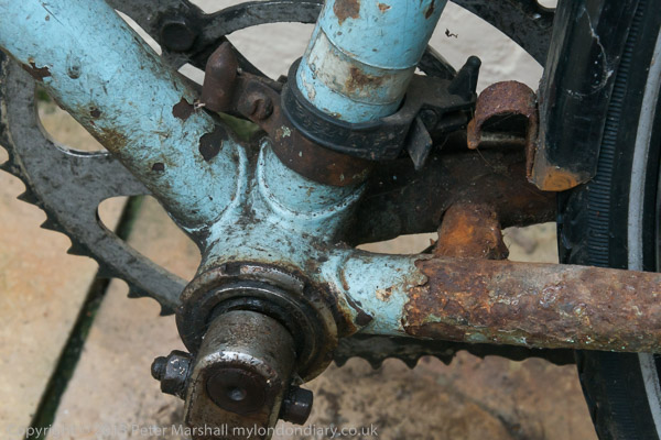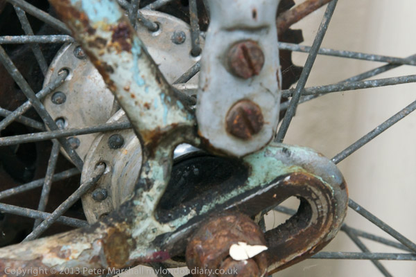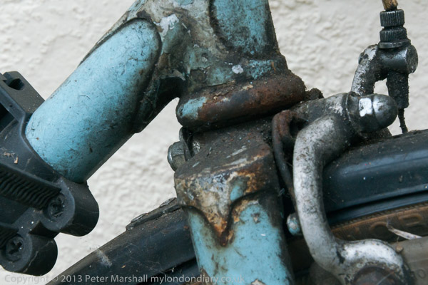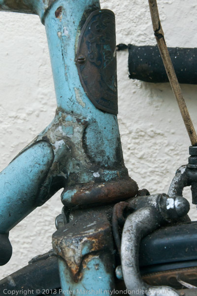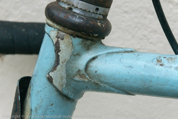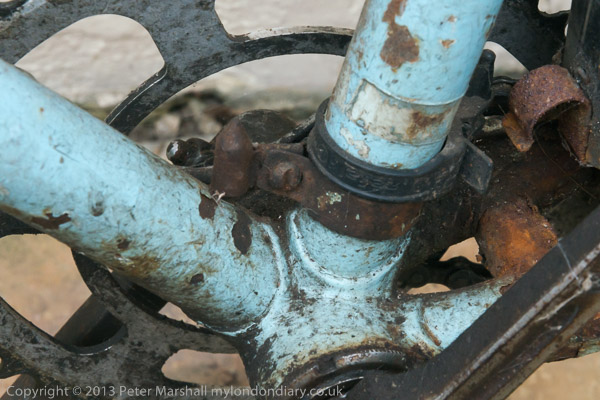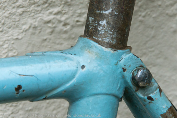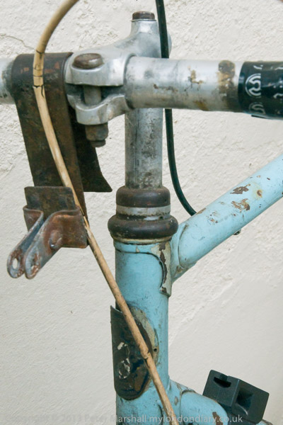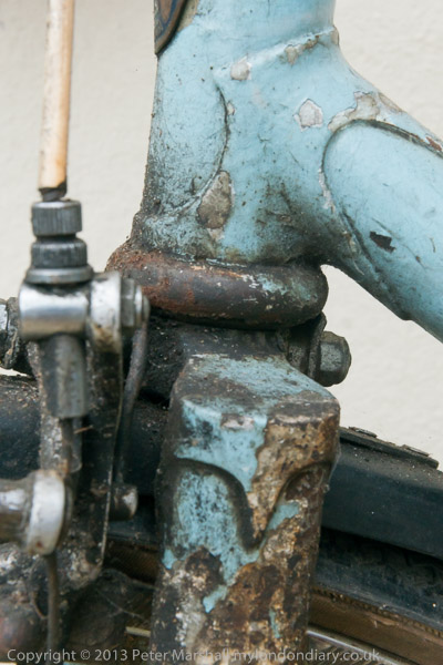 ![]() A 1956 or 7 Cinelli frame, but now in a very poor state ![]() The handlbars and stem are original - and you can see the Cinelli shield - later bikes just had paint ![]() ![]() Badly pitted by rust, but traces of the earlier paintwork have been revealed as the repaint comes of f ![]() People have been known to go into ecstacies over these details of the Cinelli frame. ![]() |
