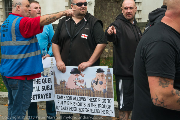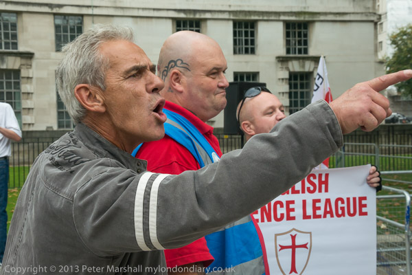 An EDL member points and shouts at a counter-protester who has stopped to call the EDL racists