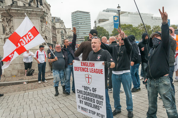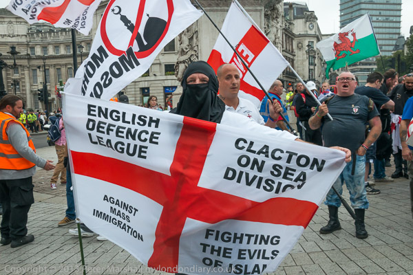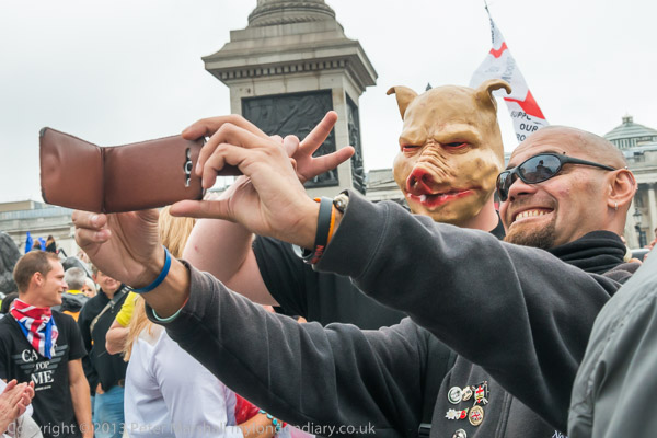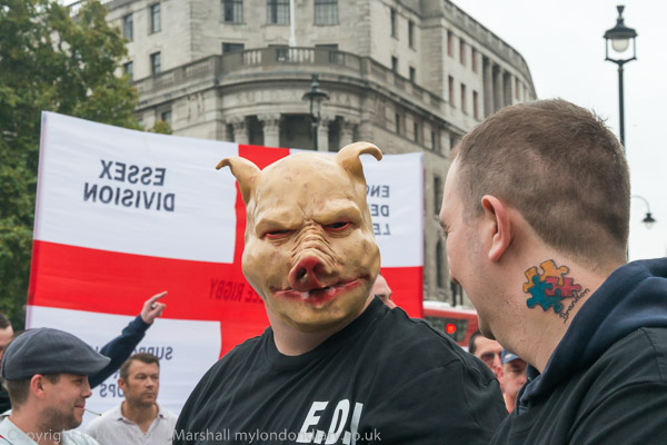 One man in an E.D.L. Rotherham Lads shirt is wearing a pigs head - and lifts up another protester who is carrying a pink pig