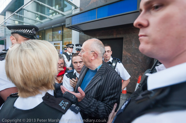 A man comes and starts an argument with the protesters, complaining they had refused to answer his question