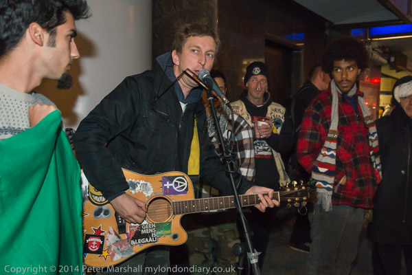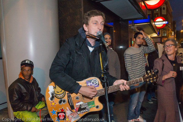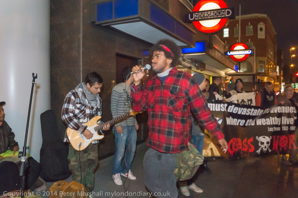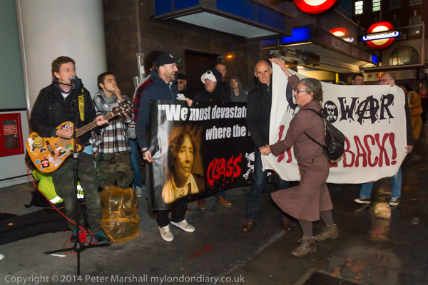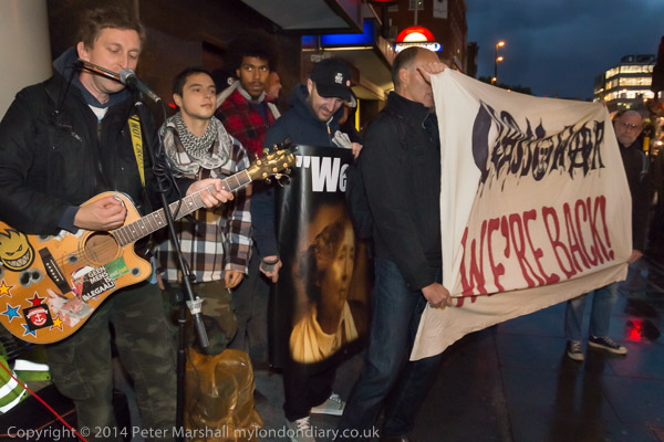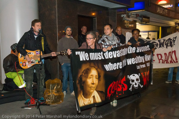 ![]() Ian Bone of Class War speaks and introduces Cosmo, who has come from Cardiff to sing at the protest ![]() ![]() ![]() ![]() Ian Bone does a little dance ![]() and so does the 'Class War We're Back!' banner with Marina Pepper as Cosmo plays and sings ![]() ![]() ![]() and Marina leads the Lucy Parsons banner too ![]() Cosmo is a great songwriter and performer - his web site is worth a visit and you can hear some of the songs he performed |