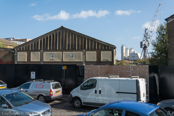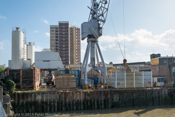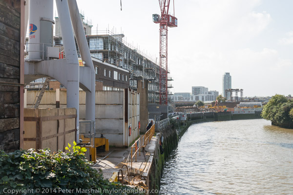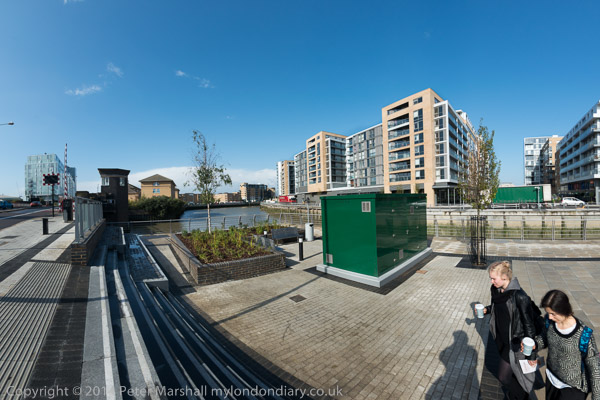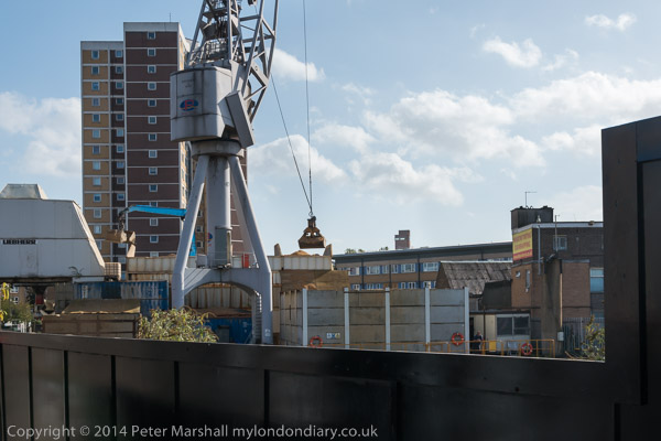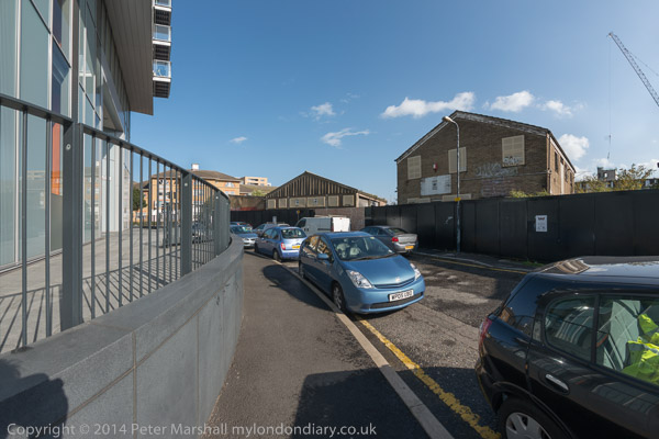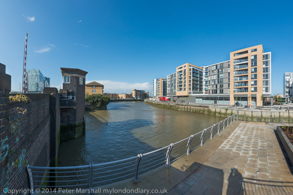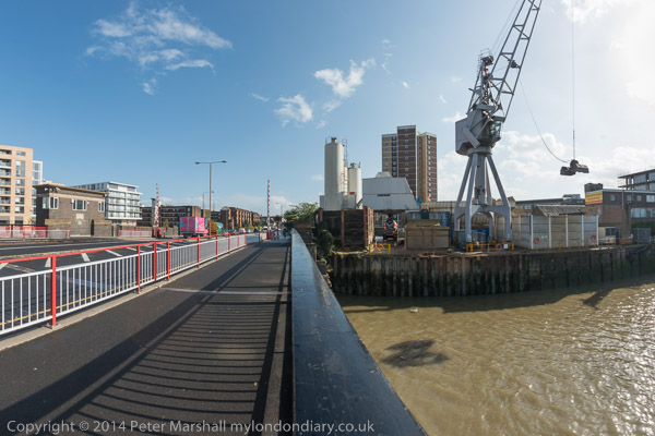 Looking south from the east end of Deptford Creek Bridge, straight into the midday sun