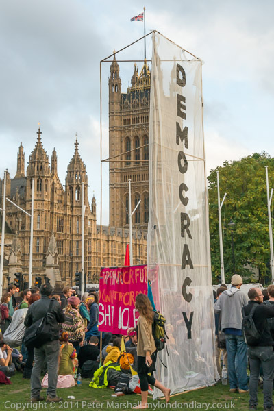 Other protesters watch from outside the area which is now marked out by yellow flags as a 'Safe Space'