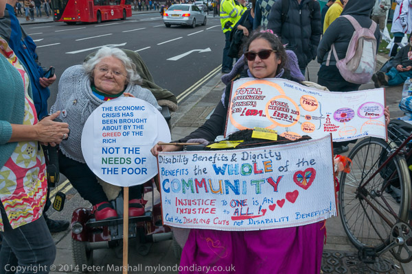 Some of the protesters remain on the pavement - the grass is a little muddy for wheelchairs, though some go on it
