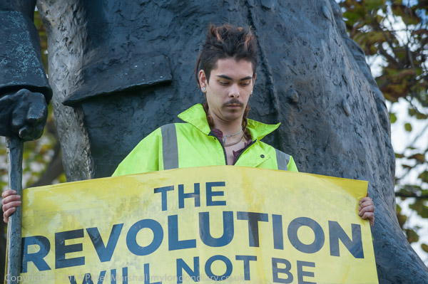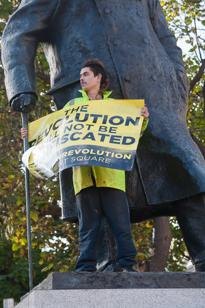 One protester had gone up to join Chuchill on his plinth shortly before I arrived, with a banner which read: