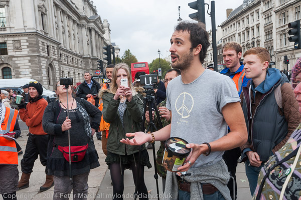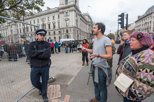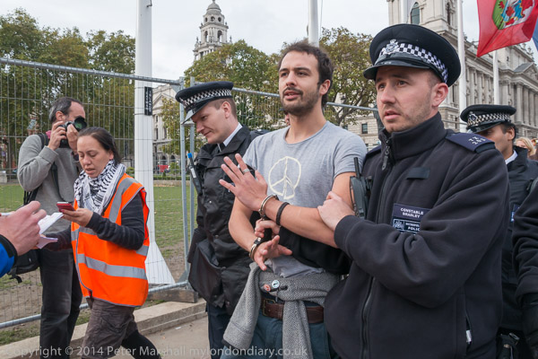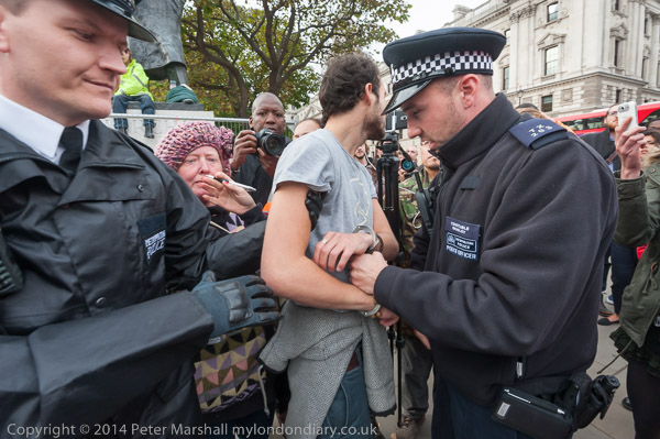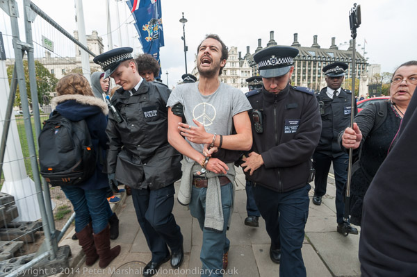 Martin Powell is still performing his poem 'The Missing Peace' as they lead him towards a police van.