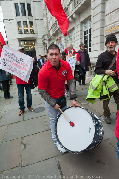 The protesters continue to walk in a circle on the pavement in front of the Bloomberg offices