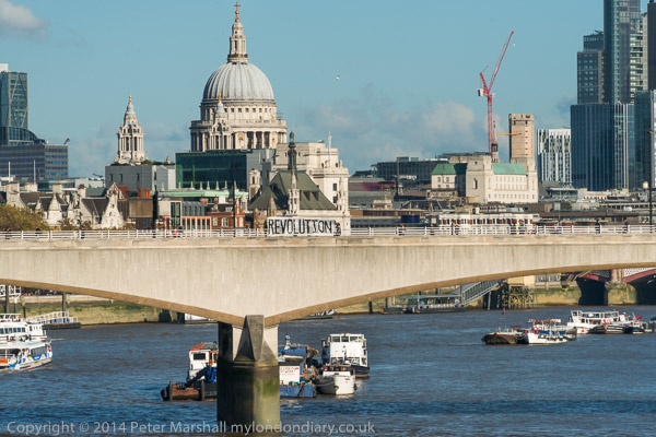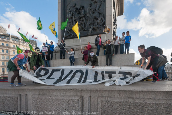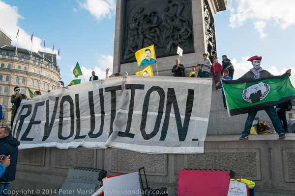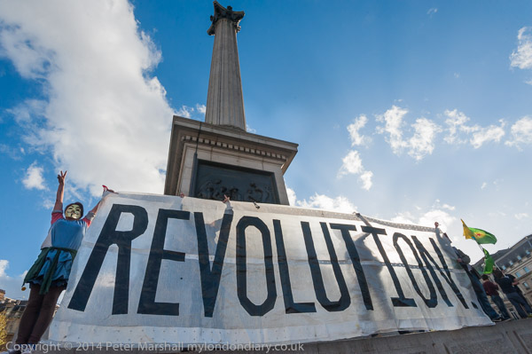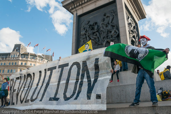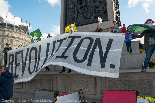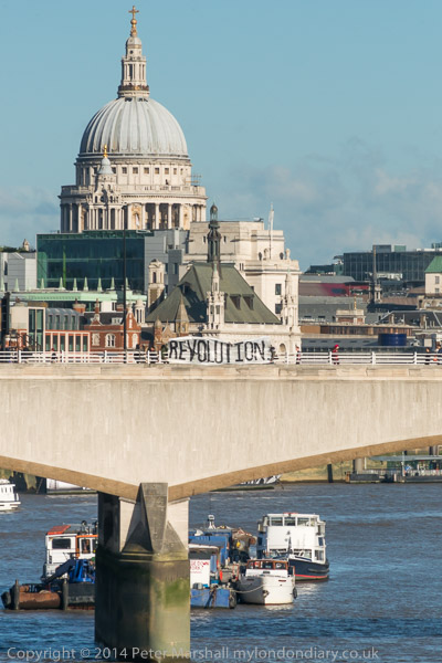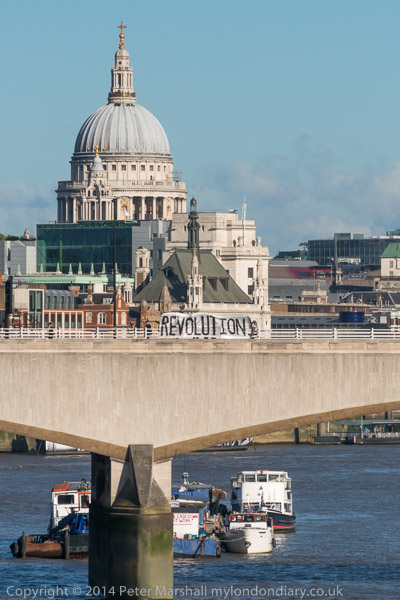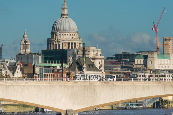 'Anonymous' protesters, some in Guy Fawkes masks held up a banner with the message 'REVOLUTION' on Waterloo Bridge