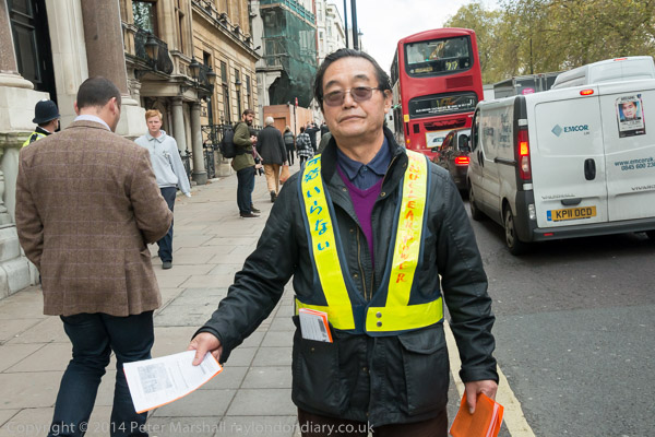 A Japanese anti-nuclear protester hands out information about Fukushima outside the Japanes Embassy