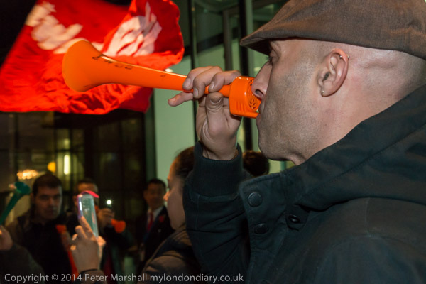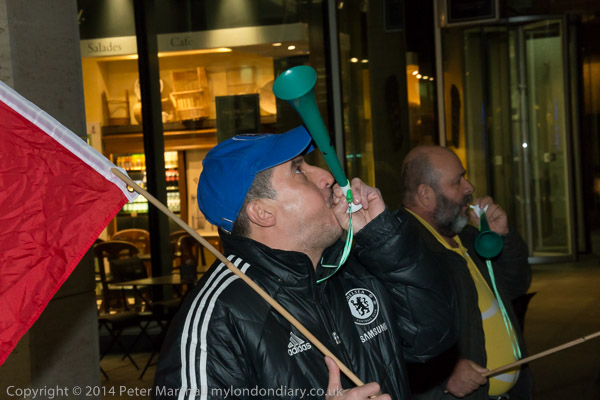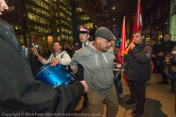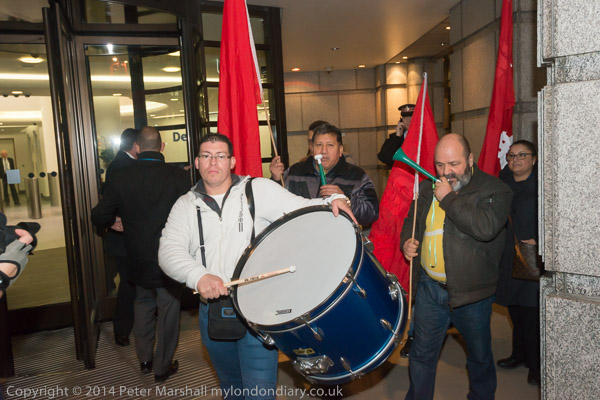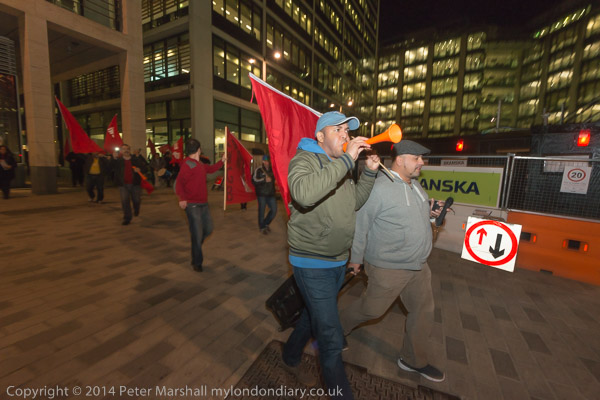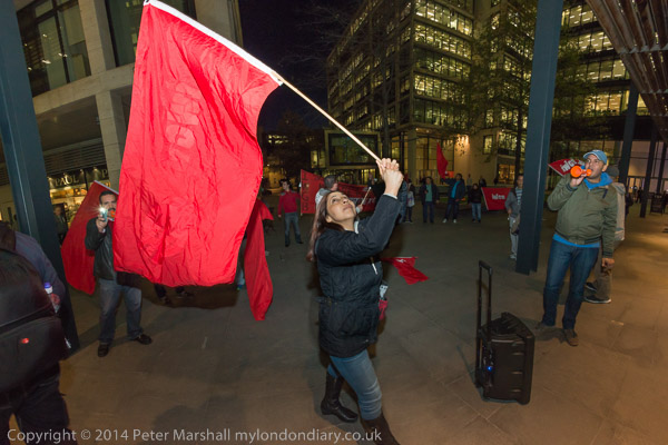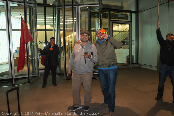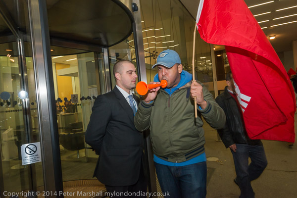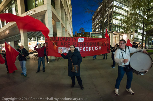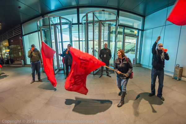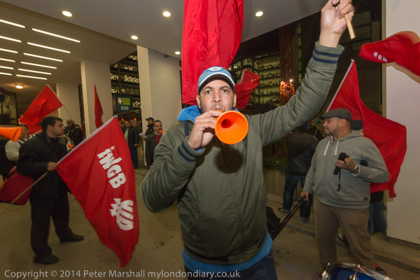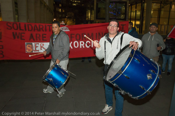 The cleaners with their IWGB banner 'Solidarity - We are perfroming SercoExorcism' with drums, flags and horns
