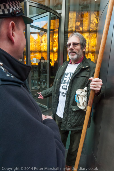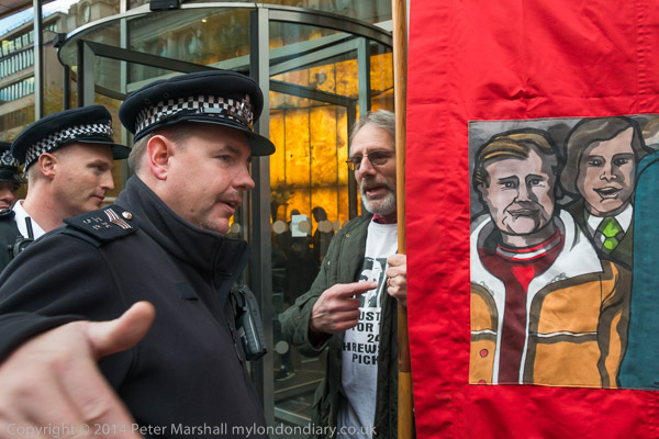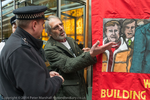 Police officer tries to move the Justice for the Shrewsbury Pickets banner from the pavement outside the IPCC claiming it is obstructing the pavement.