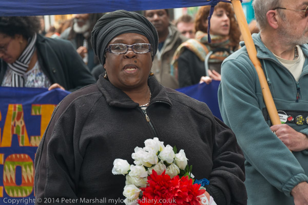 Ricky Bishop's mother Doreen carrying flowers in front of the banner at the head of the march - with sister Rhonda