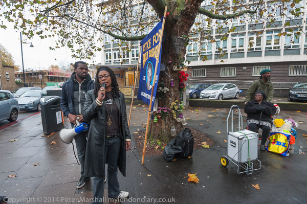 Marcia Rigg's speech is interrupted by shouts from inside the police station, accusing her of lying