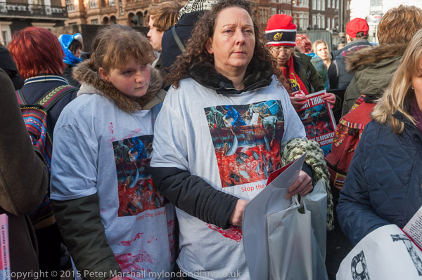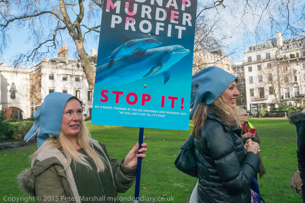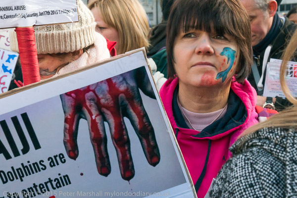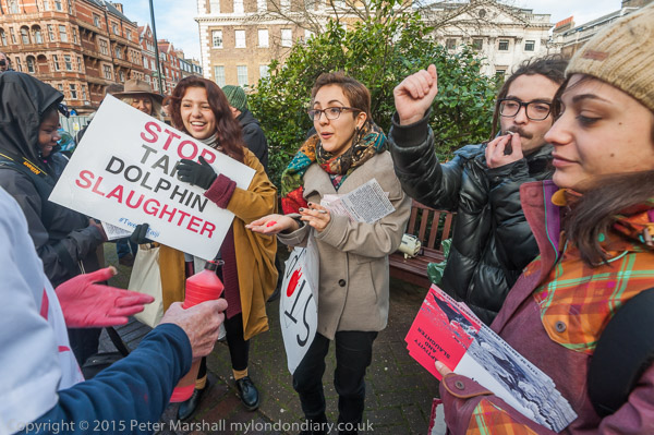 'Stop the Slaughter' t-shirts with a photograph of the blood-red sea during the annual Taiji massavre