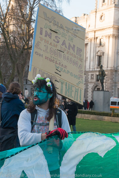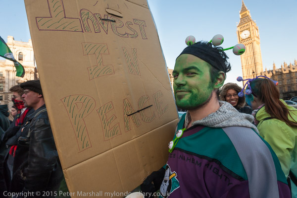 A nuclear mutant holds a large placard 'Invest in Peace'