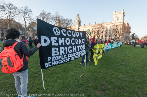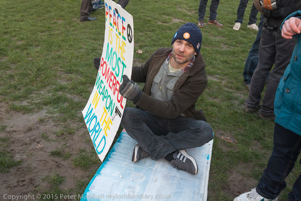 No tarpaulins, but a placard is useful for sitting on the damp ground