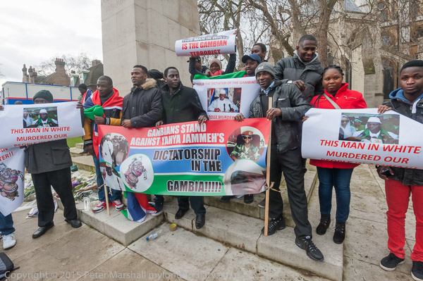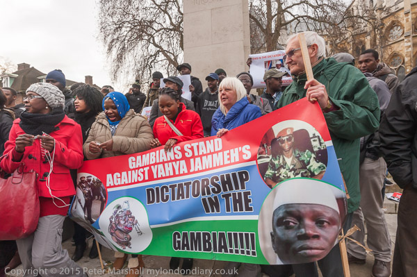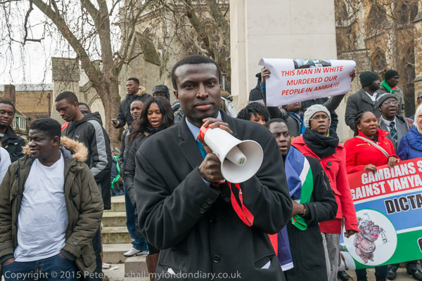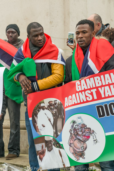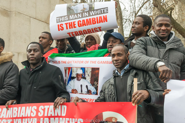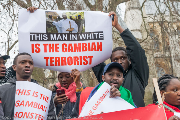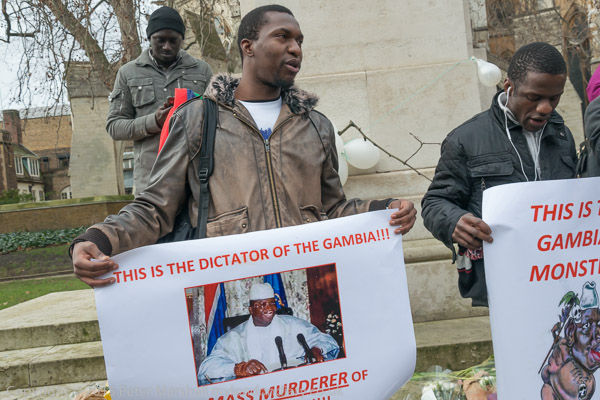The banner against the Gambian dictator Yahya Jammeh and posters saying he murdered our people