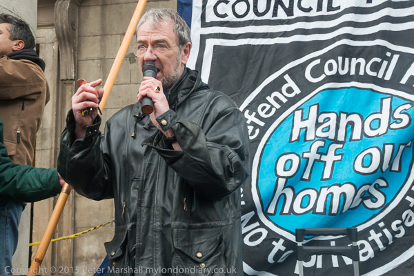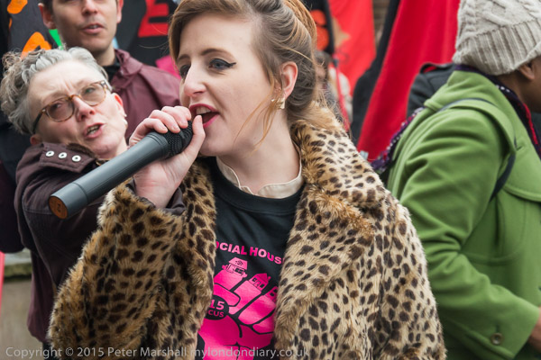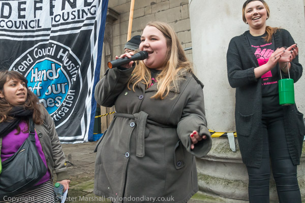Jasmine speaking next to the 'Defend Council Housing' banner