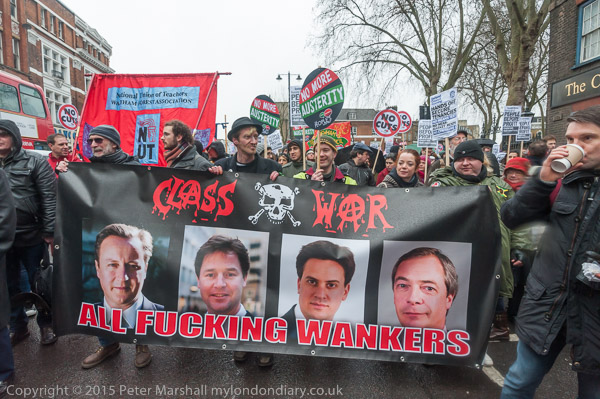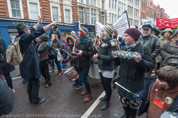 Outside the churchyard people are ready to march - Class War with their Lucy Parsons Banner