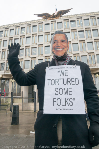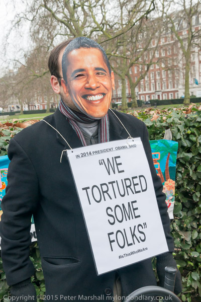 including Dan who is wearing an Obama mask and a quote from President Obama 'We tortured some folks'
