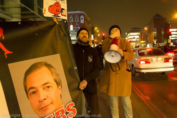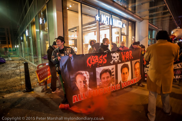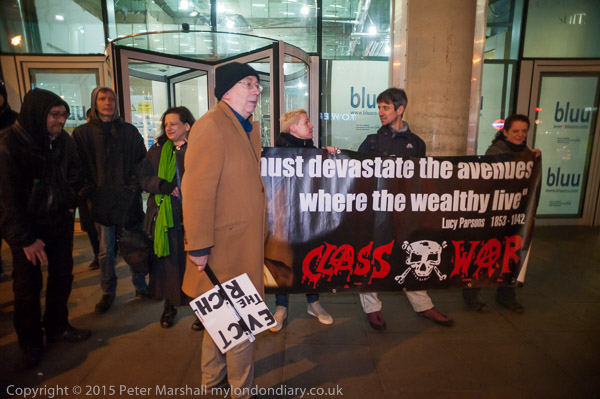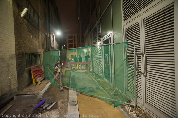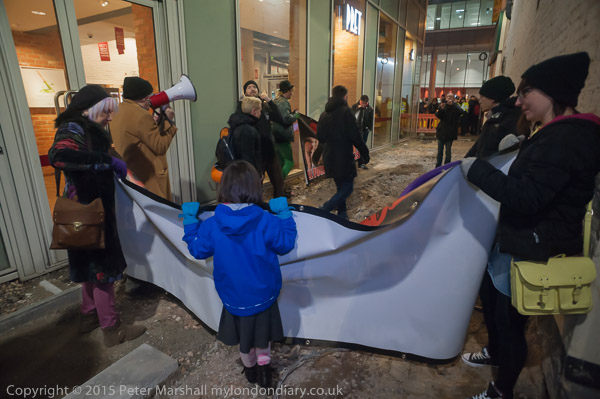 Police guard the poor door for the protest - perhaps it is still broken? The lighting has been improved