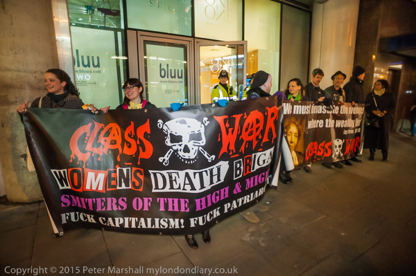 Building work is taking place, and the alley is closed off, but Class War pose in it with the Womens Death Brigade banner